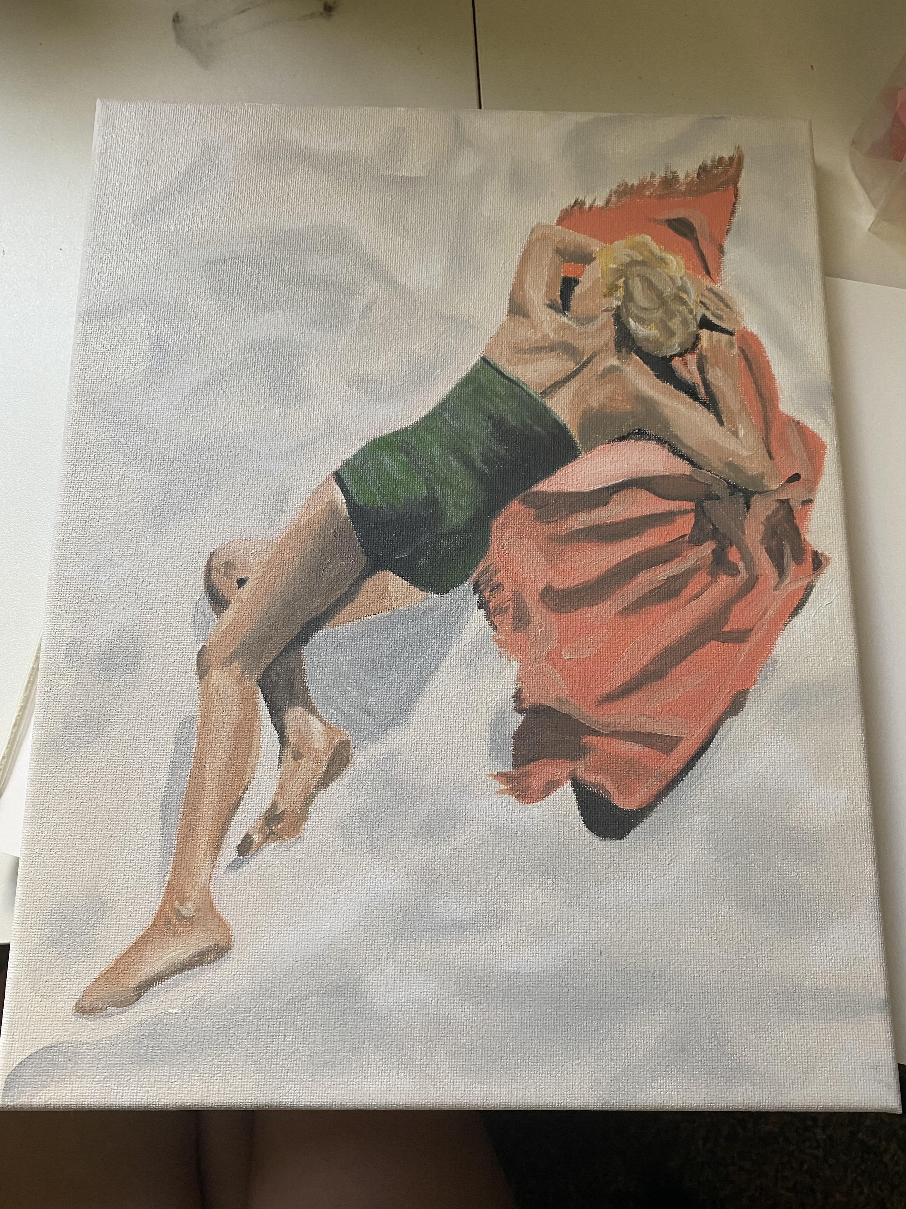 i’ve been more into sketching this week - i felt inspired to practice depicting bodies and made a small oil painting of a woman laying in the sand (based on a photo from the library of congress flickr account). i think it looks pretty good - the sand was a struggle and the blanket still needs fixing.